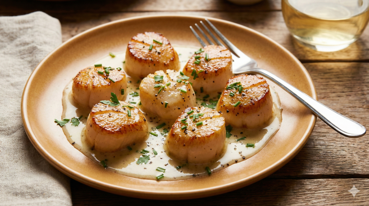 Des Saint-Jacques juste saisies, encore tièdes, et la table change d’allure. Le parfum de beurre et d’iode monte vite, sans effort.